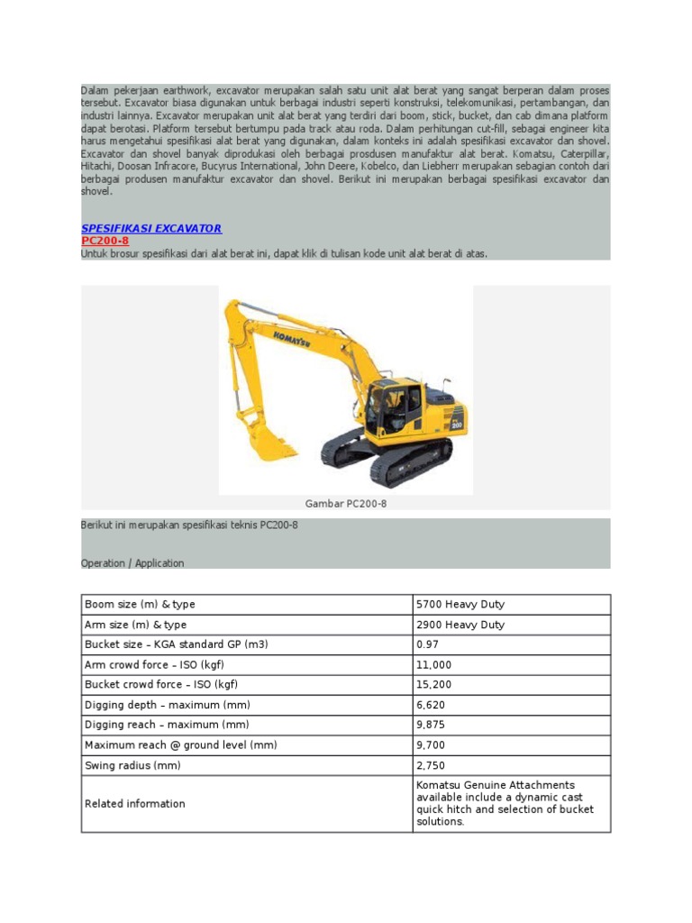 Spesifikasi Alat Berat Excavator Pc 200 – Berbagai Alat